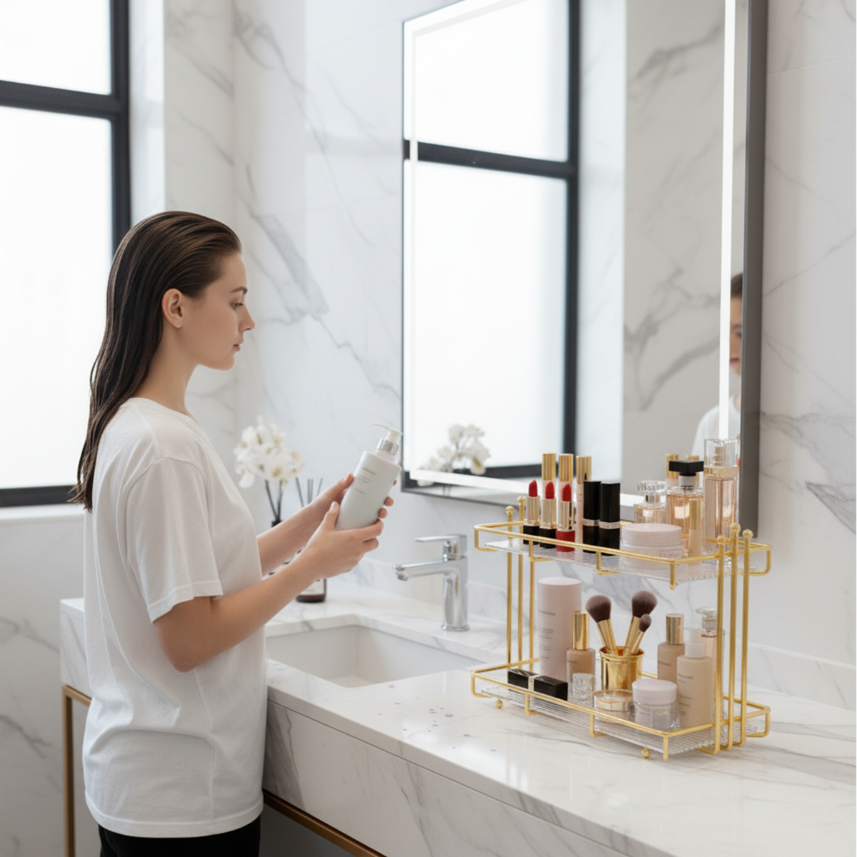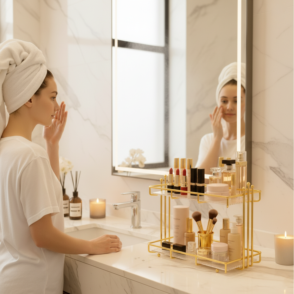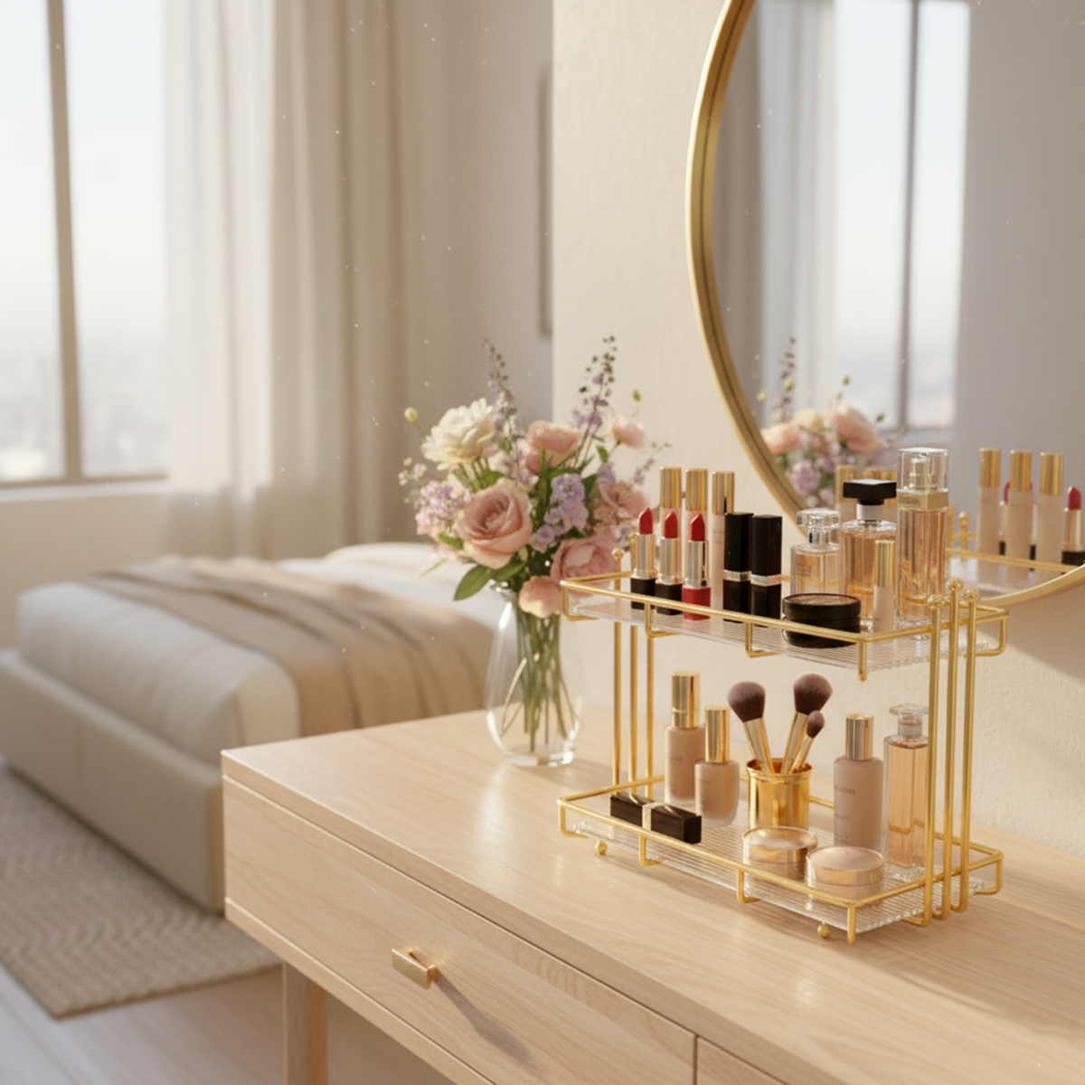 Name: Cosmetics Shelf Material: Metal + Acrylic Glass Layers : Double-layer Scene: Dresser, etc.